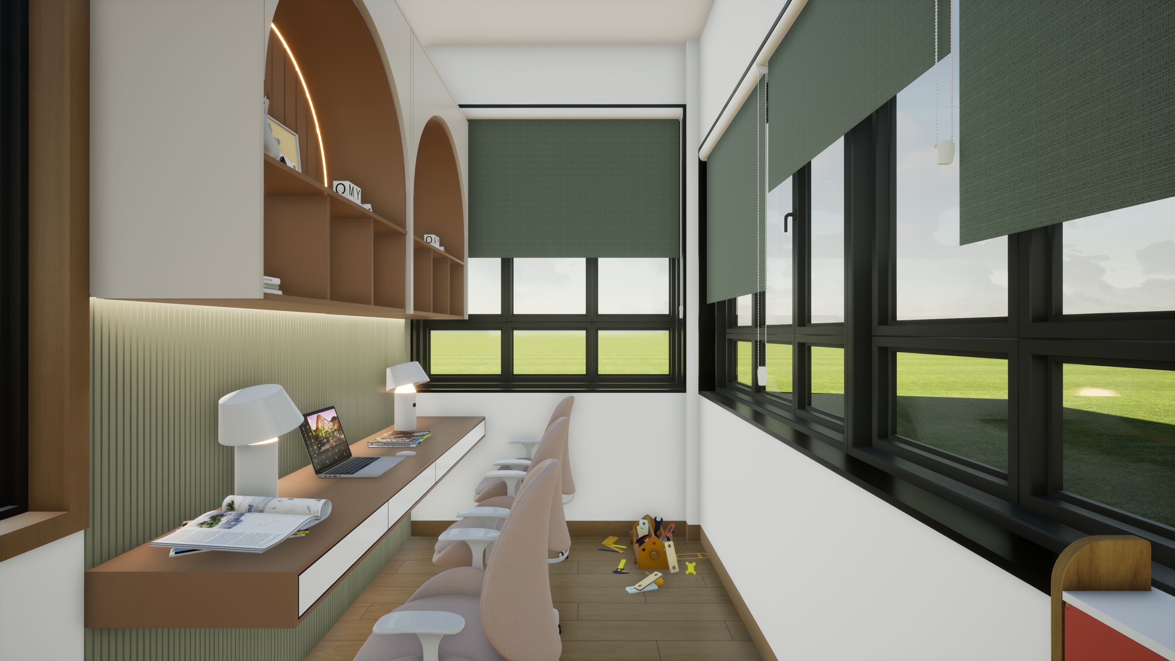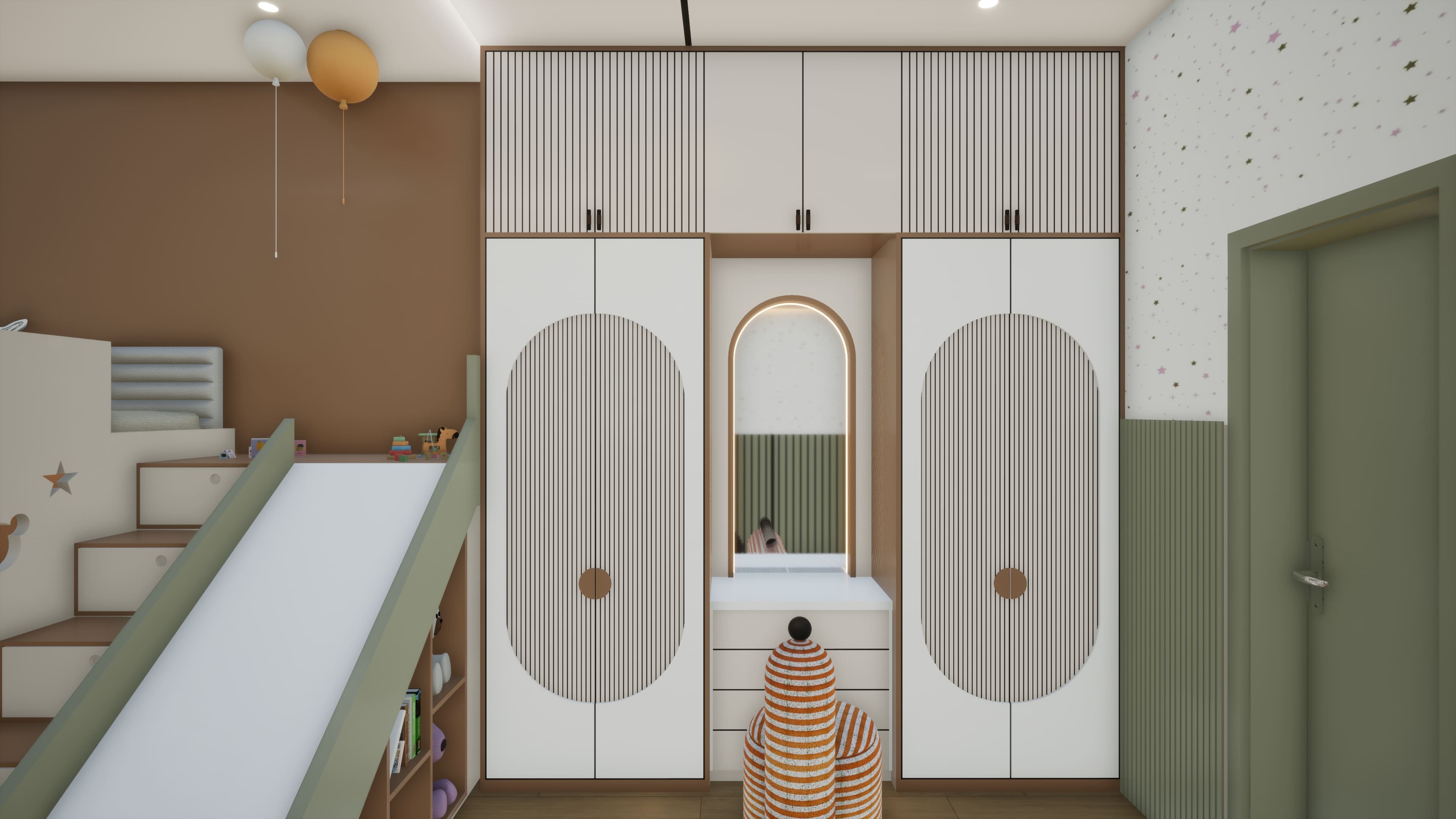 A vibrant 3D visualization of a kids’ bedroom designed to balance creativity, comfort, and functionality. The space features playful color schemes, smart storage solutions, and child-friendly furniture layouts. Attention is given to lighting, textures, and safety, creating an engaging environment that supports both relaxation and learning.